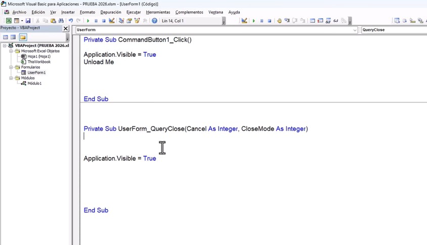 - Excel oculto: Si cierras el formulario sin programar la X, Excel queda oculto. Usa QueryClose para evitarlo.