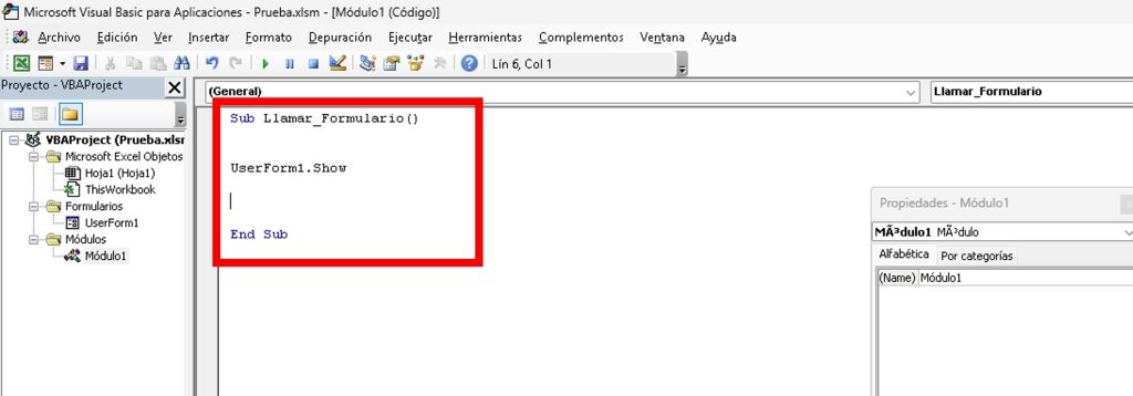 - En el Explorador de Proyectos, haz doble clic en Modulo1 > macro LlamarFormulario.