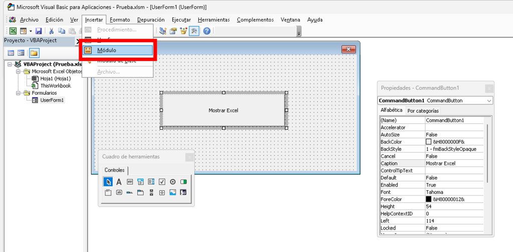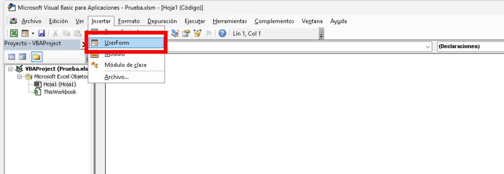 - Ve a Insertar > UserForm.