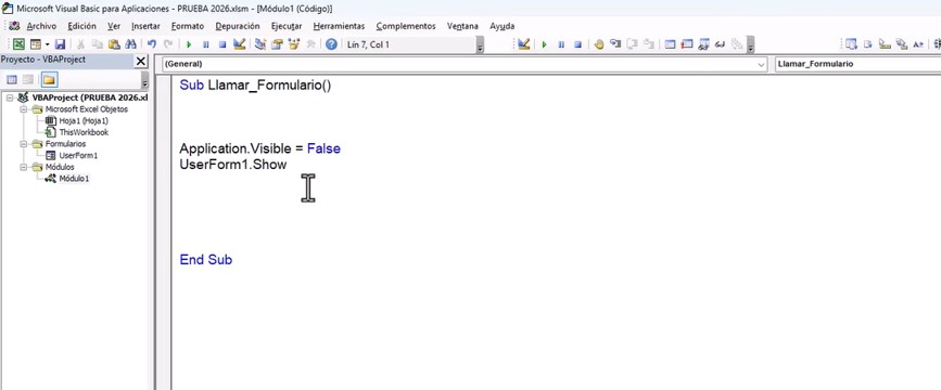 - Resultado: Excel se oculta, y solo se muestra UserForm1.