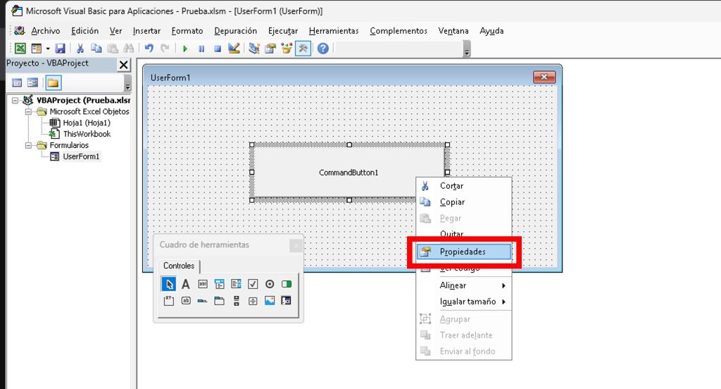 - En el Editor de VBA, haz doble clic en UserForm1 para abrir el diseñador.