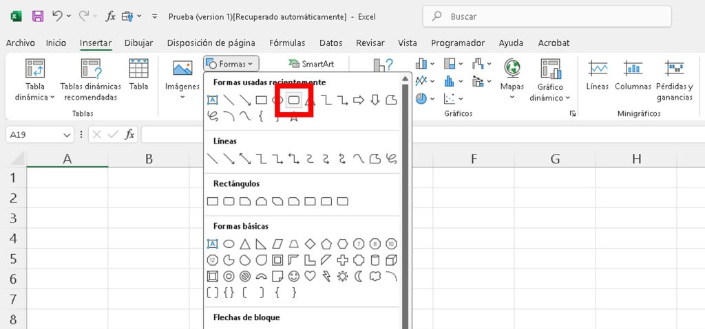 - Ve a Insertar > Formas y selecciona cualquier forma (por ejemplo, un rectángulo).