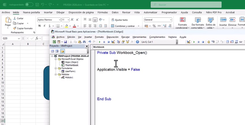 Paso 5: Ocultar Excel antes de mostrar el formulario 🙈