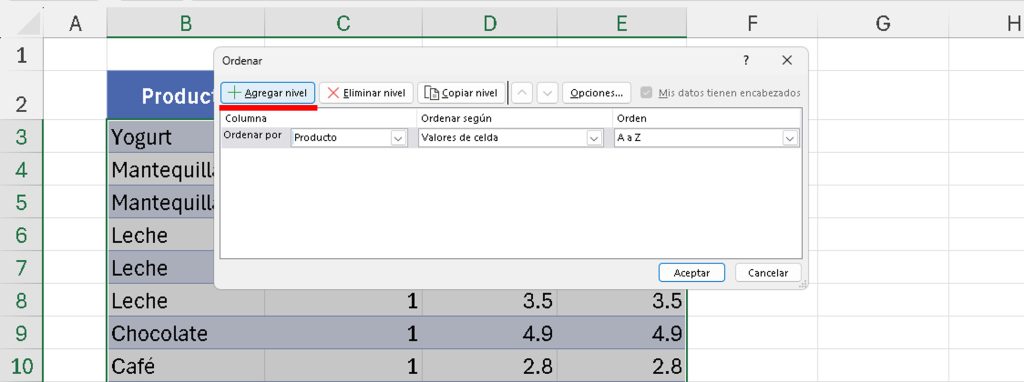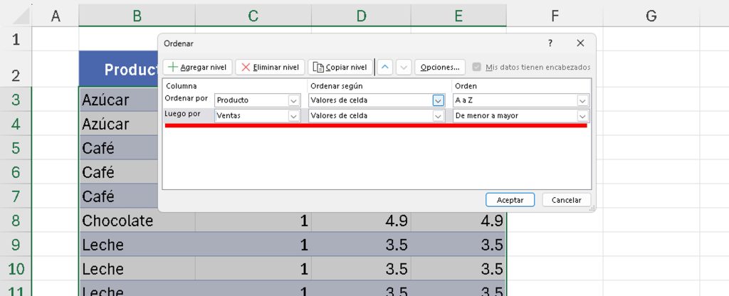 Nota: Puedes añadir más niveles para criterios adicionales (por ejemplo, ordenar por «Cantidad» como tercer criterio). 🌟