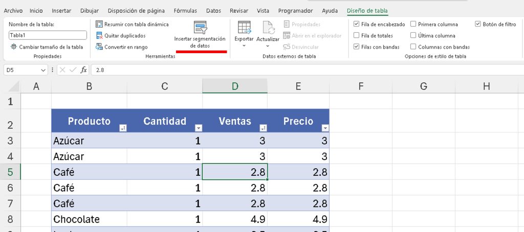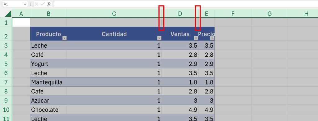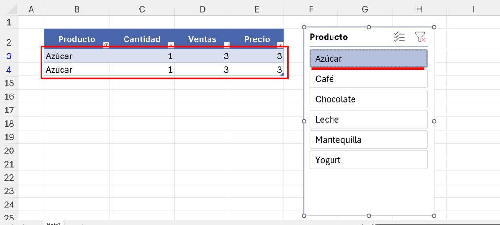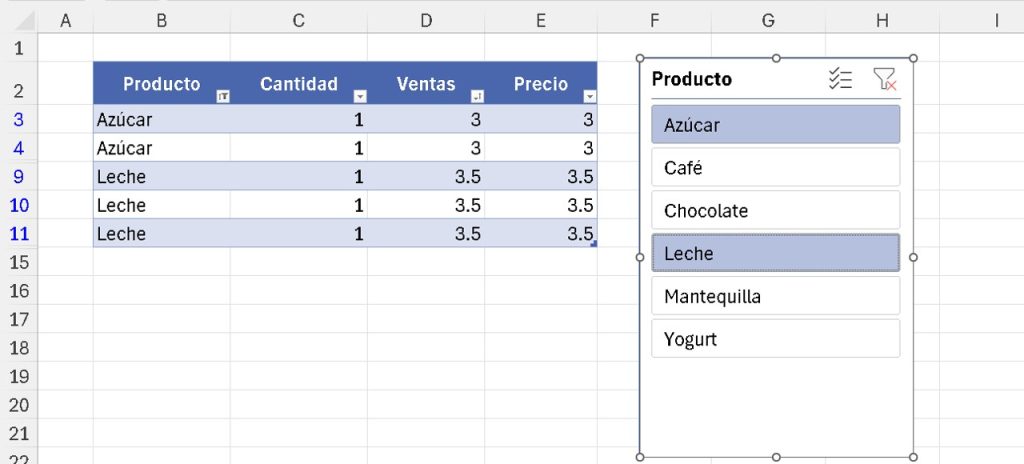 - Múltiples filtros: Mantén Ctrl y selecciona varios valores (por ejemplo, «Azúcar» y «Leche»).
