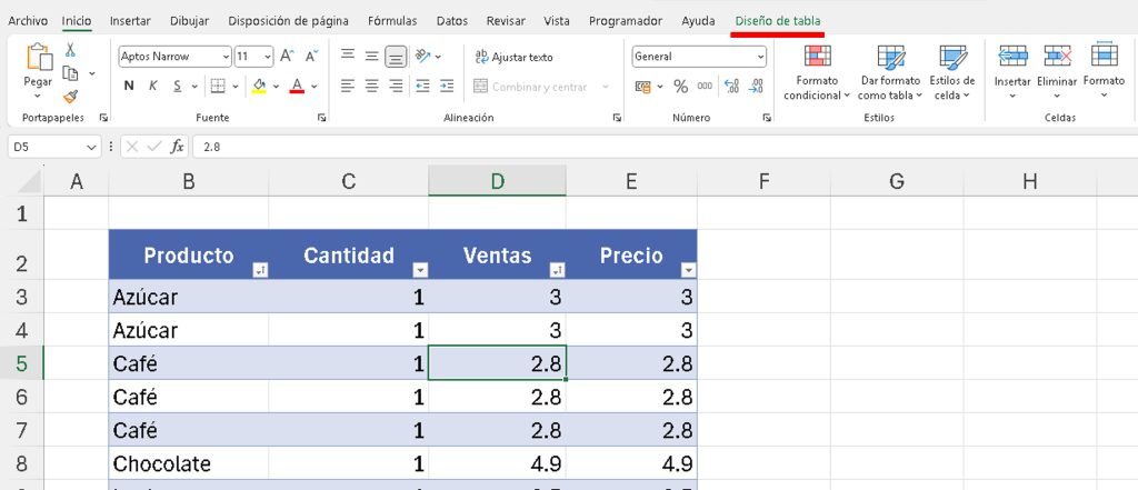 - Haz clic en la tabla para activar Diseño de tabla.