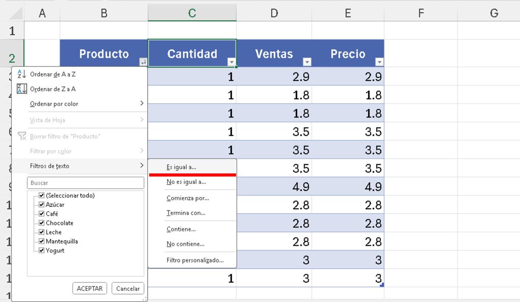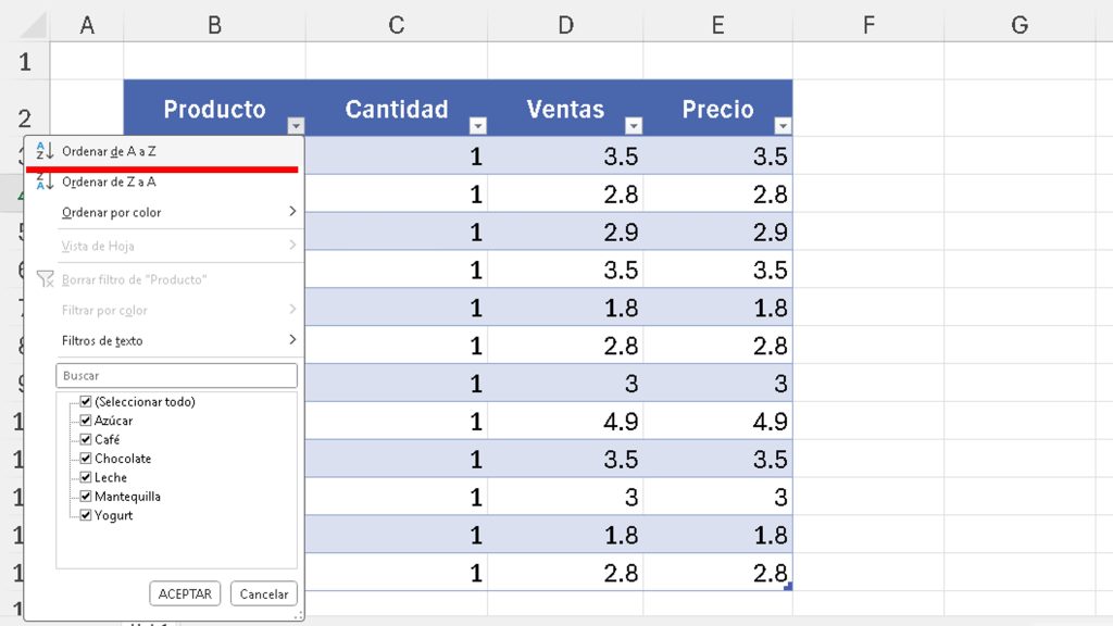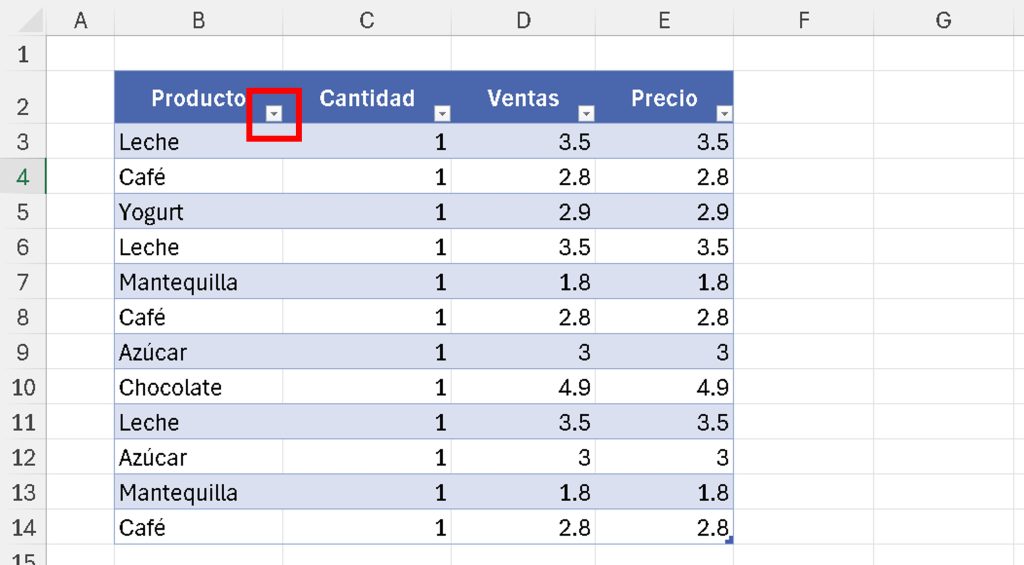 - Haz clic en la flecha de filtro en el encabezado (por ejemplo, «Producto»).