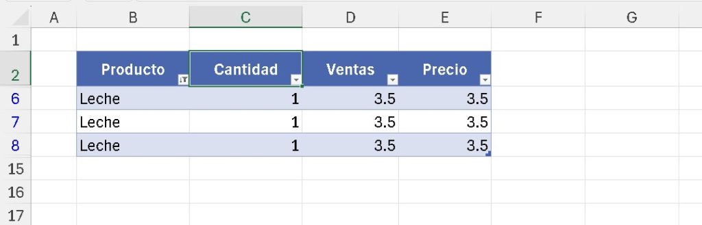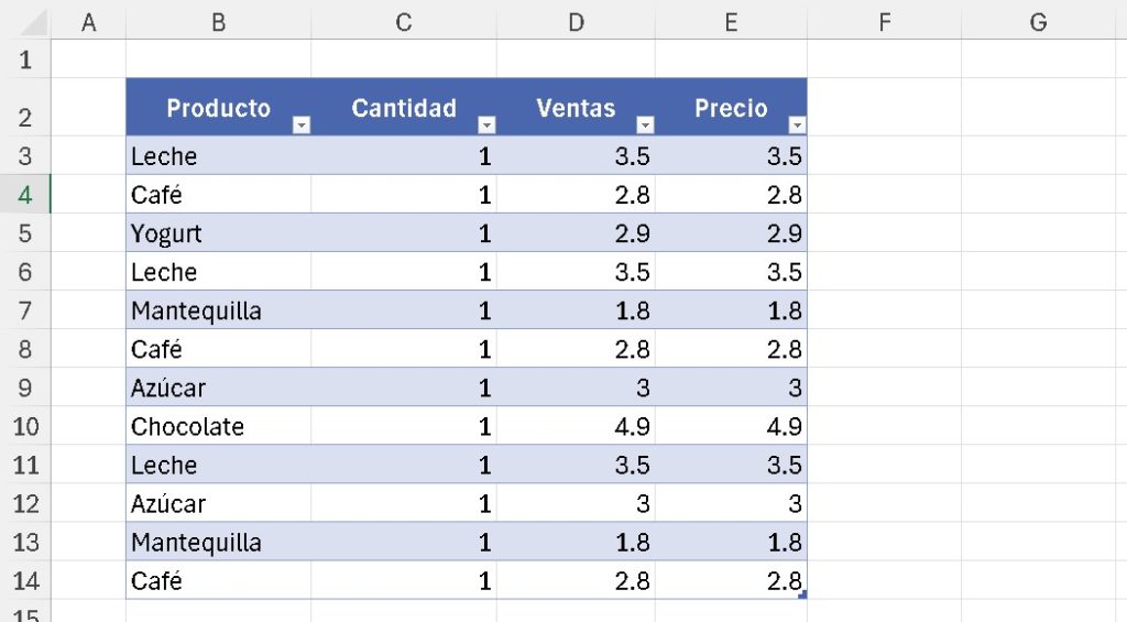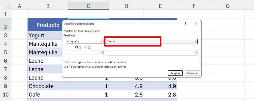- Resultado: Solo se muestran filas con «Leche».
