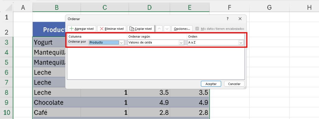 - Ordenar por: Selecciona «Producto» > Orden: De A a Z.