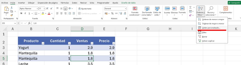 - Ve a Inicio > Ordenar y filtrar > Orden personalizado.