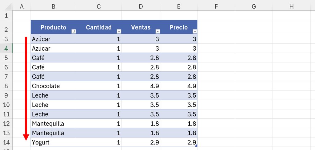 - Resultado: Los productos se ordenan alfabéticamente (A-Z); si hay productos repetidos (por ejemplo, dos «Azúcar»), se ordenan por «Ventas» de menor a mayor.
