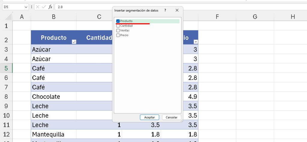 - Selecciona un campo (por ejemplo, «Producto») > Aceptar.