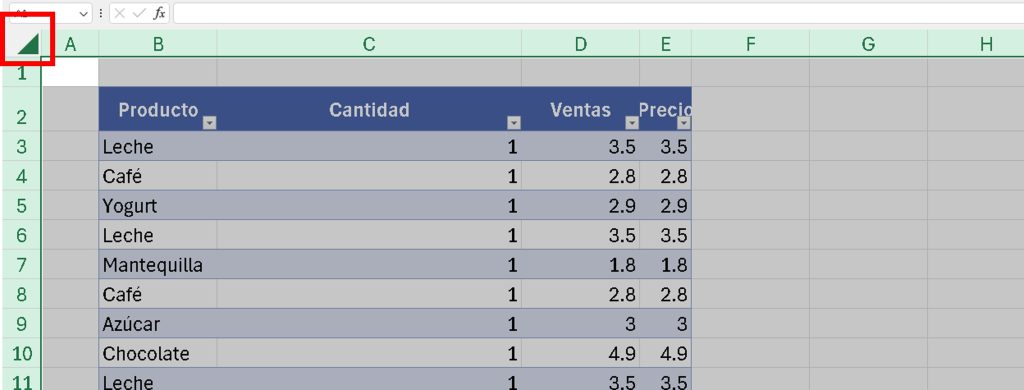 - Haz clic en el triángulo superior izquierdo (esquina del libro) para seleccionar toda la hoja.