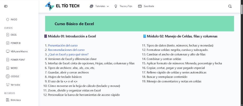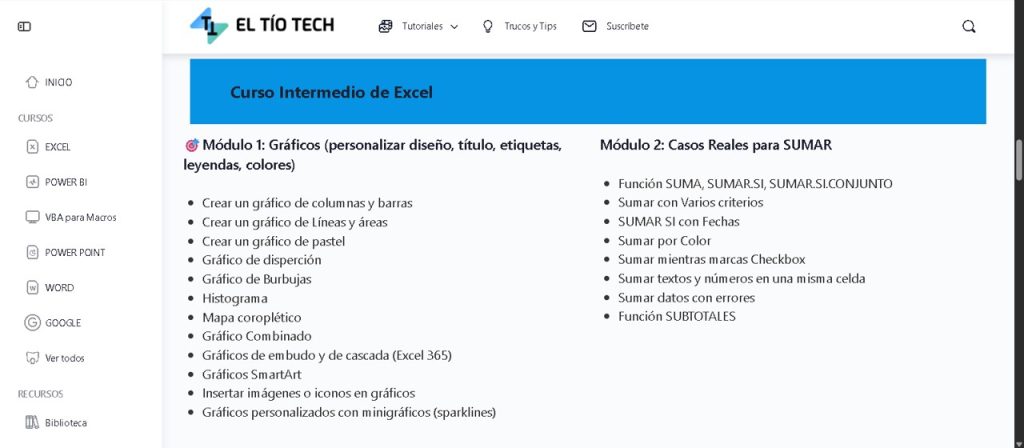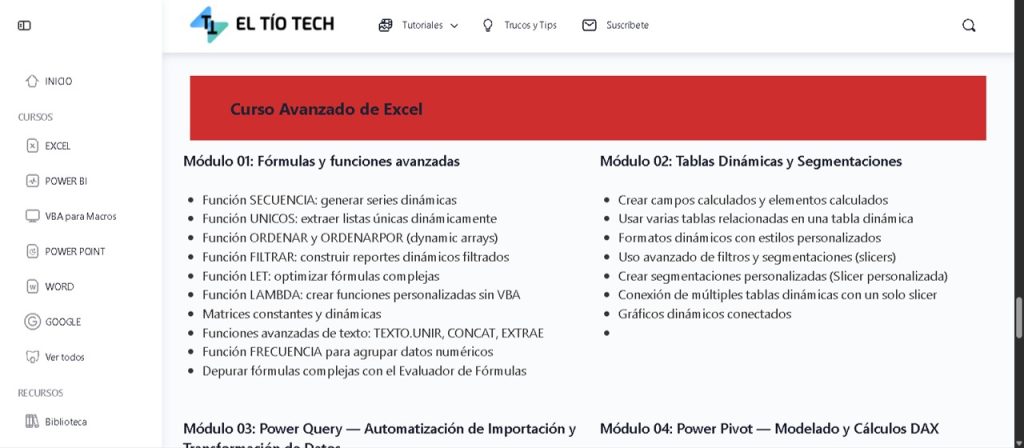 - Único: Gratuito, práctico, 3 niveles, Power Query/Pivot, VBA.