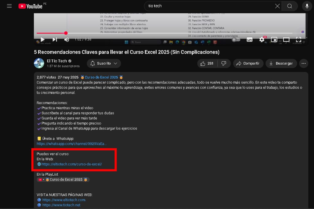 - Mueve el video flotante y abre Excel para practicar en tiempo real.