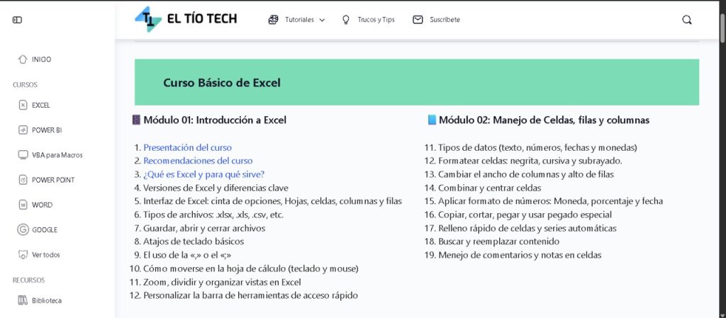 - Página web: Módulos (básico, intermedio, experto) con capítulos, ejercicios descargables (próximamente) y resúmenes en vivo.