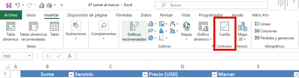 Ve a la pestaña Insertar y busca la opción de Casilla de verificación dentro de los controles.
