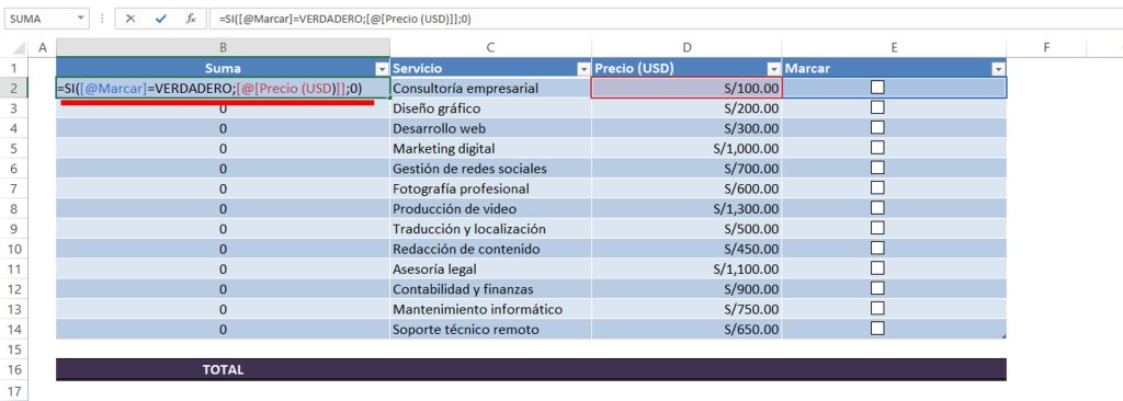 =SI([@Marcar]=VERDADERO;[@[Precio (USD)]];0)