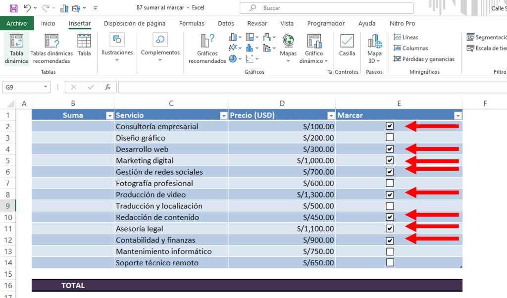 Con este método podrás sumar solo los valores que marques, ideal para presupuestos, listas de compras o controles de tareas.