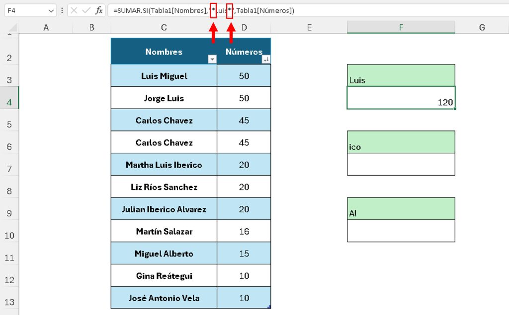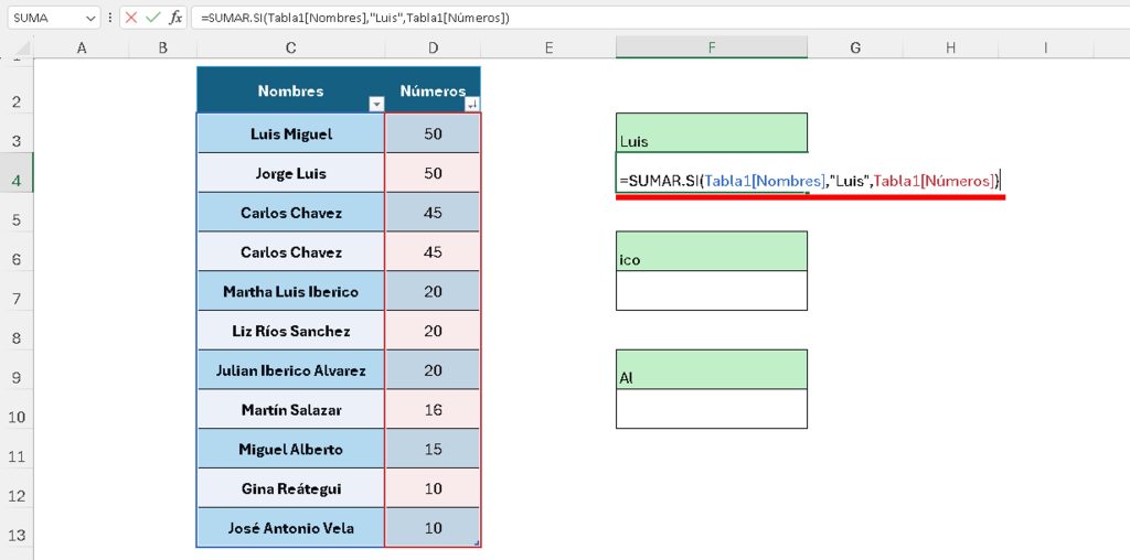 =SUMAR.SI(Tabla1[Nombres],"Luis",Tabla1[Números])