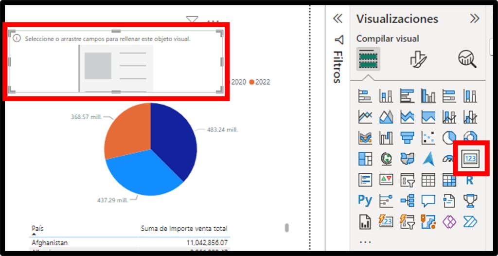 - Arrastra el campo que deseas mostrar en la tarjeta, como importe total de ventas, a la sección de campos.